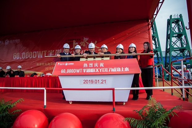 1月21日,由南通象嶼海洋裝備有限責(zé)任公司(以下簡(jiǎn)稱(chēng)“象嶼海裝”)建造的60,000DWT半潛船順利出塢。江蘇泛洲船務(wù)有限公司董事長(zhǎng)江厥杰、中國(guó)科學(xué)院自動(dòng)化研究所軍事顧問(wèn)原海軍訓(xùn)練基地副司令員張錦榮、江蘇省交戰(zhàn)辦主任林有鎮(zhèn)、南京交通運(yùn)輸局局長(zhǎng)徐衛(wèi)國(guó)、中國(guó)船級(jí)社江蘇分社副總經(jīng)理張東標(biāo)、象嶼集團(tuán)黨委委員、象嶼股份黨委書(shū)記、總經(jīng)理、象嶼海裝董事長(zhǎng)鄧啟東等共計(jì)200多名各界人士參加了象嶼海裝60,000DWT遠(yuǎn)洋自航半潛船上水儀式。