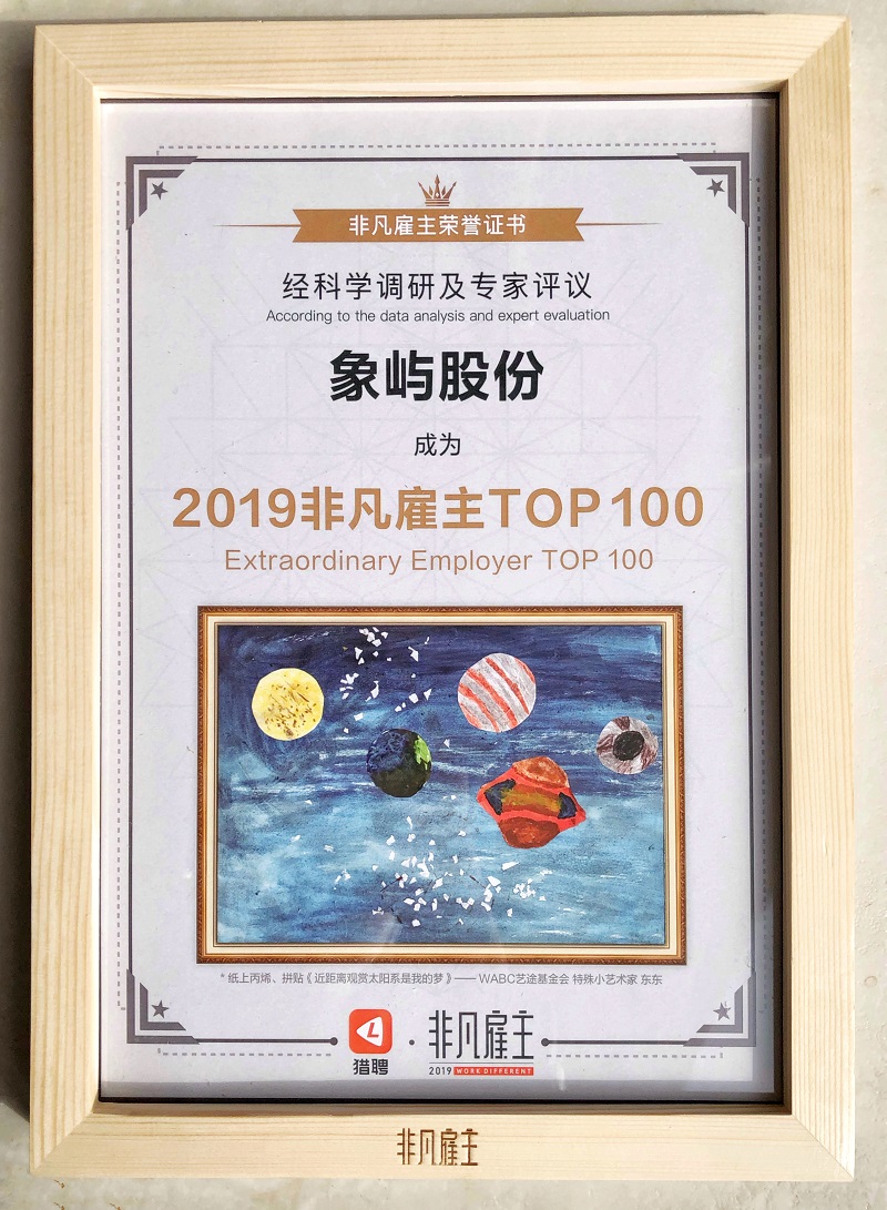 12月13日,由國內(nèi)精英職業(yè)發(fā)展平臺(tái)獵聘網(wǎng)主辦的2019非凡雇主“非凡之夜頒獎(jiǎng)盛典”在廣州舉行。象嶼股份從上萬余家企業(yè)中脫穎而出,入選“2019非凡雇主TOP 100” 及“2019福建變革非凡雇主”。