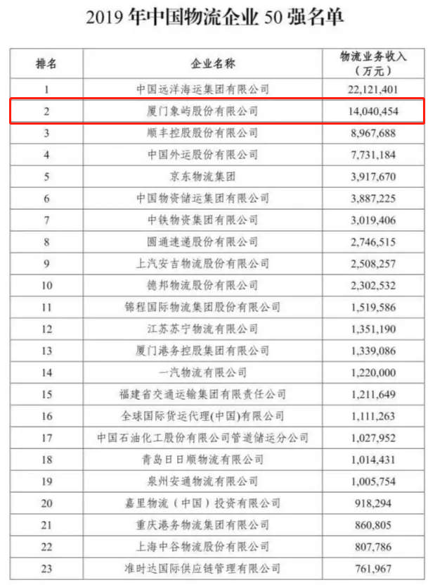 象嶼股份蟬聯(lián)第二!中國物流企業(yè)50強榜單出爐