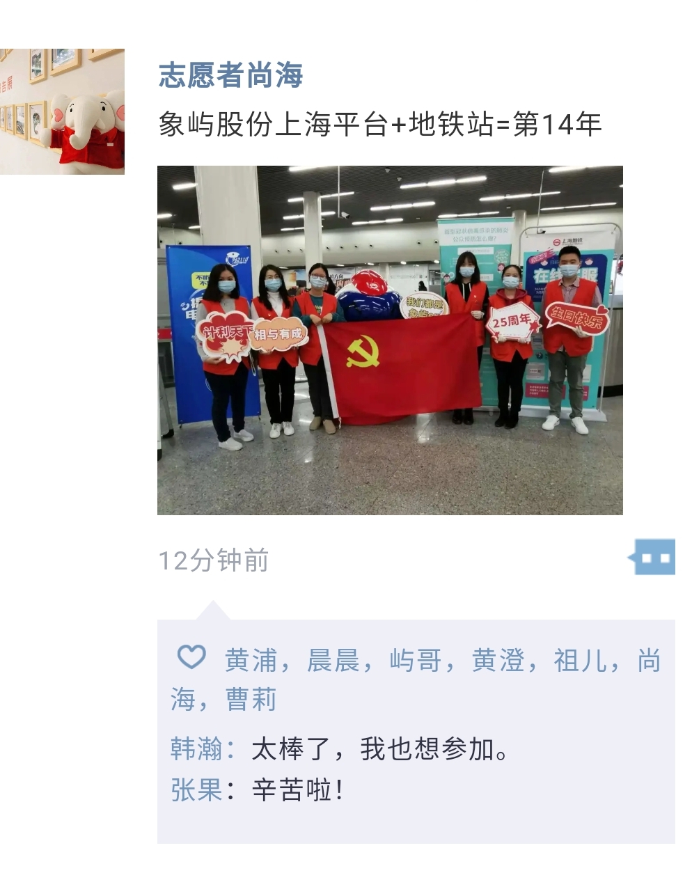 這是象嶼股份上海平臺志愿者走進(jìn)地鐵站的第14個年頭。作為城市文明的先行者和宣傳者,志愿者們十四年如一日,堅(jiān)持用真誠主動的服務(wù)為出行的乘客送上溫暖,讓“象嶼紅”成為地鐵站里一道亮麗的風(fēng)景線。