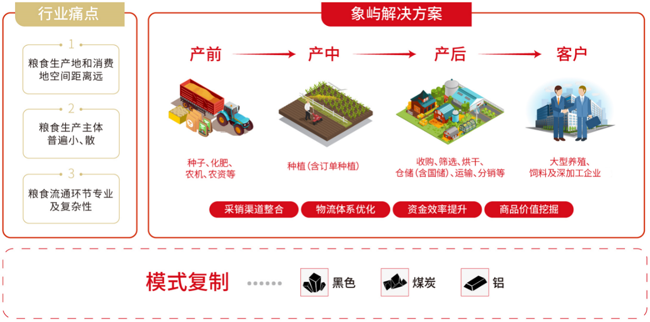 今年初,象嶼聯(lián)手阿里云結(jié)合東北農(nóng)業(yè)實(shí)際,攜手在糧食板塊先行先試建設(shè)農(nóng)業(yè)產(chǎn)業(yè)級互聯(lián)網(wǎng)平臺。該平臺將貫穿糧食產(chǎn)業(yè)鏈種植、倉儲、流通三大環(huán)節(jié),借助物聯(lián)網(wǎng)、云計(jì)算、區(qū)塊鏈?zhǔn)侄螌?shí)現(xiàn)輕資產(chǎn)模式下倉容快速擴(kuò)張,連接用糧方、金融、物流等生態(tài)方,提升全產(chǎn)業(yè)鏈貿(mào)易、物流與金融效率。 未來,象嶼農(nóng)產(chǎn)將做深“一條鏈”,做大“一個(gè)園”,形成共創(chuàng)共享共贏的全產(chǎn)業(yè)鏈資源生態(tài)系統(tǒng),圍繞“雙循環(huán)”發(fā)展格局,進(jìn)一步優(yōu)化投資結(jié)構(gòu),延伸投資鏈條,創(chuàng)新產(chǎn)業(yè)模式,為鄉(xiāng)村振興、促進(jìn)農(nóng)業(yè)高質(zhì)高效發(fā)展貢獻(xiàn)力量!